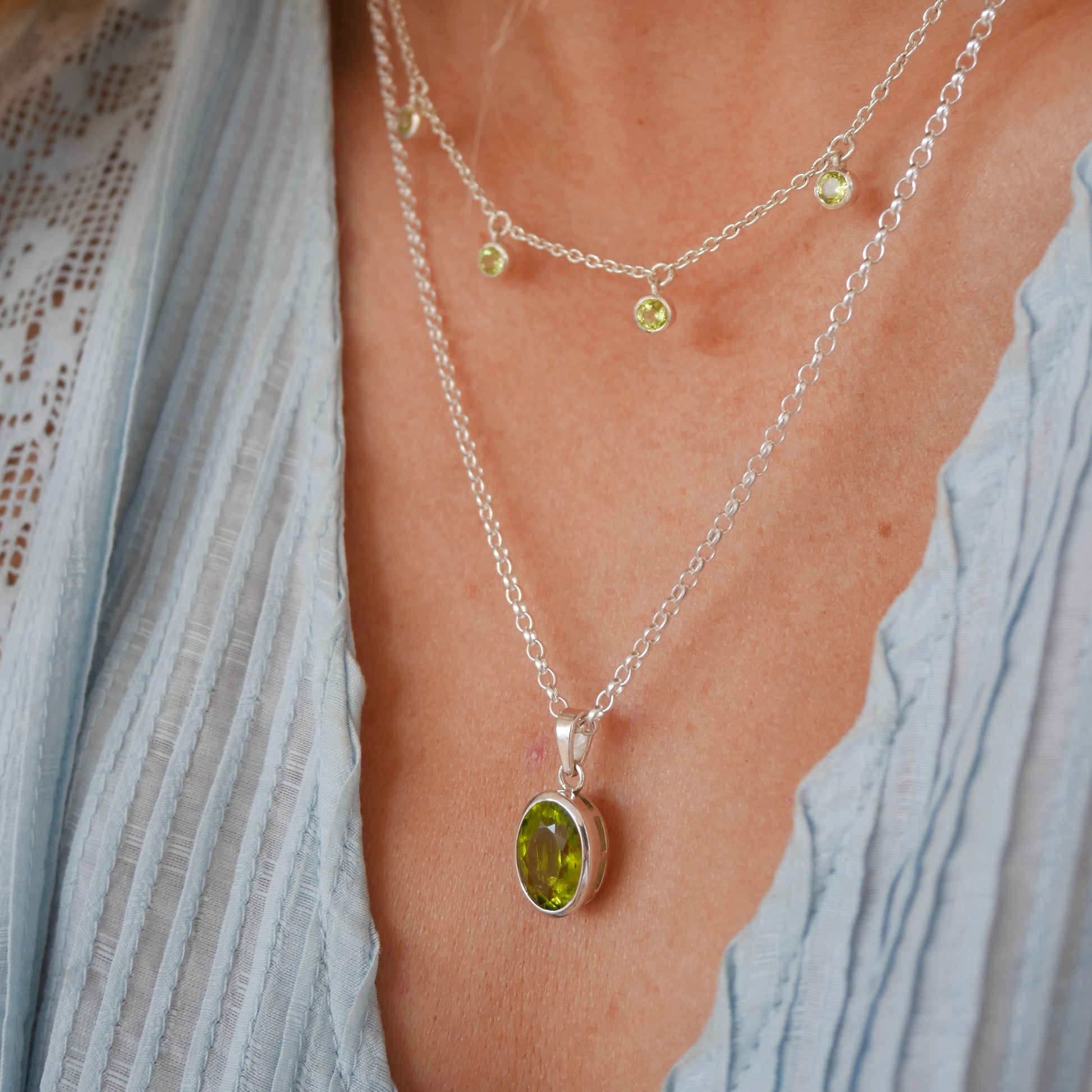 925 Sterling Silver pendant featuring a faceted oval cut Peridot gemstone set in an open back bezel with light slits to really enhance the stone and help it catch the light. Finished on a 925 Sterling Silver belcher chain, measuring 18" in length.
